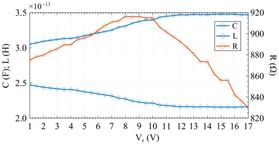 Values of the R, C and L equivalent circuit model components as functions of control voltage .