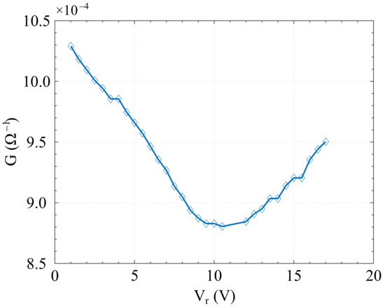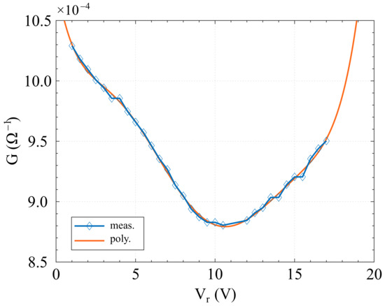 In our modeling procedure, the polynomial expression of nonlinear conductance =(V) for a certain = was simply obtained from the G = by first shifting the origin of the curve in , and then calculating the polynomial coefficient as the one at the minimal distance from the extrapolated value with a proper order. In the interpolation procedure, was set at 10 V, and the corresponding shifted curve is illustrated in Figure 14, which also shows the polynomial at the minimal distance from the extrapolated value. The best fitting was obtained with a sixth-order polynomial whose corresponding expression is reported in Equation (7).