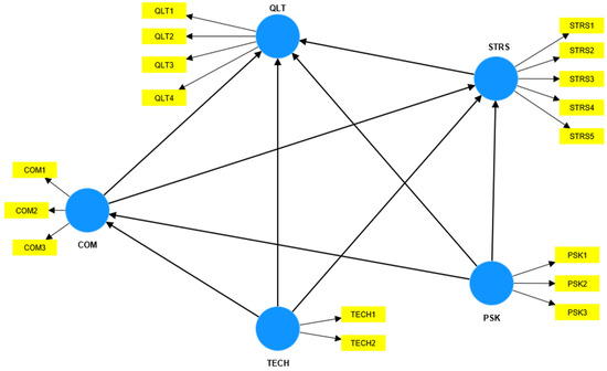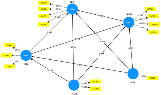 The constructs’ reliability and validity are presented in Table 4. Cronbach’s Alpha measures the consistency and the reliability, and the average variance extracted (AVE) measures the variance of the constructs in the model. The values for Cronbach’s Alpha are higher than 0.8 for COM, QLT, PSK, and STRS, indicating very good reliability, and the value for TECH is higher than 0.5, corresponding to acceptable reliability [43]. The values for AVE are higher than 0.6, and for Composite Reliability they are higher than 0.7, indicating good reliability and the validity of the variables. In addition, we determined the value for the standardized root mean square residual (SRMR), which was 0.077, showing that the proposed model has a good fit [44].