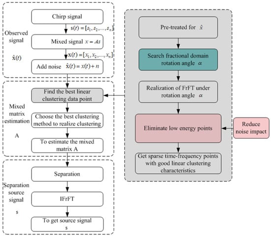 Combined with the introduction of the fractional Fourier transform, this paper attempts to find the parameters α in the fractional Fourier transform, then the fractional Fourier transform is implemented for the time-domain mixed signal so as to obtain more sparse time-frequency points, improve the time-frequency point clustering characteristics of the signal and achieve the purpose of improving the estimation accuracy of the mixed matrix. Simply understood, it is to transform the mixed signal into a rotated time-frequency plane, which can make the data points show more obvious linear clustering characteristics. This system is the α-UBSS proposed in this paper. The algorithm flow chart is shown in Figure 1. In this algorithm, because the fractional domain transformation is not sensitive to noise [], the noise appears as low energy points in the fractional domain, and the low energy points can be removed to achieve the purpose of noise removal. In summary, using this algorithm, the linear clustering characteristics are increased, whereas the influence of noise is reduced.