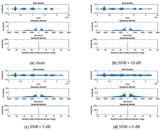 Four groups of speech signals (clean speech signals and noisy speech signals with a signal-to-noise ratio of 10 dB, 5 dB and 0 dB) are subjected to fractional domain FT of the same order (p = 0.9943), as shown in Figure 4: