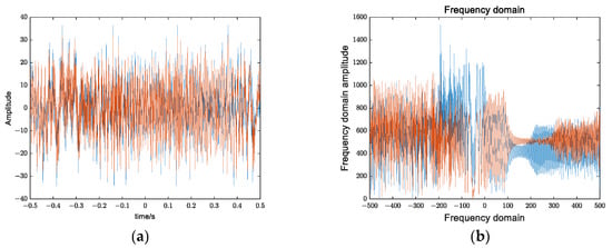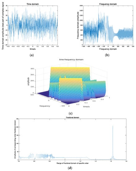 The above analysis verifies the unified time–frequency characteristic of FrFT. The fractional Fourier domain can be understood as rotating the time–frequency plane obtained by FT by a certain angle []. This plane integrates the information of the time domain and frequency domain. Compared with the static time–frequency plane obtained by FT, the fractional domain can more accurately characterise the characteristics of time domain and frequency domain, and is more suitable for the blind source separation system (without prior known conditions). Although STFT realises time–frequency display by adding a window to FT, the fixed window makes the time–frequency resolution not too high. To improve the window, it needs to pay the cost of computing, so this paper chooses FrFT to implement BSS. In addition, the insensitivity of FrFT to noise is another important reason for choosing it [,,,,].