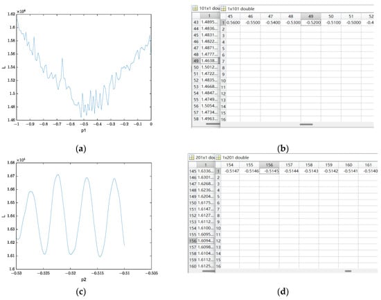 Firstly, the FrFT domain simulation experiment is carried out for single-tone signal and noise to observe the energy accumulation of single-tone signals with different signal-to-noise ratios (SNR) in the whole fractional domain. To observe data easily from the equation, we use , α is the rotation angle and p is the transformation order, as discussed in Section 2.1 above. The change from 0 to of α corresponds to the change of the signal from the time domain to the Fourier domain, and the corresponding p value is [0, 1]. To facilitate observation, the transformation is observed from the Fourier domain to the time domain, that is, α from [−, 0] and the corresponding p value is [−1, 0], so the whole fractional domain is p from −1 to 0.