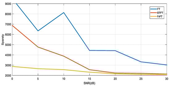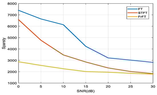 Figure 11 reveals that the sparse characteristics of various transformed signals have an evident trend with the SNR transformation, that is, the signal sparse characteristics after FrFT transformation are significantly better than FT and STFT. The signal after FrFT does not change significantly with the SNR transformation, and it is less affected by noise, which is suitable for practical applications.