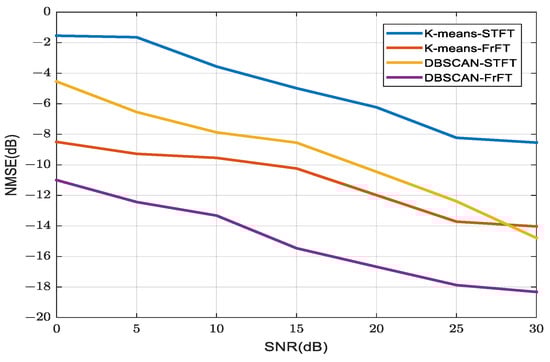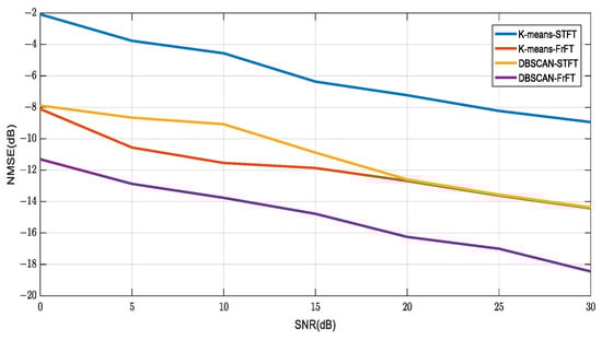 The comparison of Table 3 and Figure 12 finds that for the sparse signal data set obtained by FrFT transformation, the estimation performance of the mixed matrix obtained by the K-means clustering algorithm and DBSCAN clustering algorithm is better than that obtained by STFT transformation. The data comparison reveals that for clean signals, the superiority of the DBSCAN clustering algorithm is not evident, but in noisy signals, the performance of the K-means clustering algorithm is significantly reduced. However, the DBSCAN algorithm is not affected by noise. The main reason is that the initial value of the K-means clustering algorithm has a great effect on the clustering results. However, the DBSCAN clustering algorithm is a density-based clustering algorithm, which can filter noise points, find outliers whilst clustering and is not sensitive to outliers in the data set.