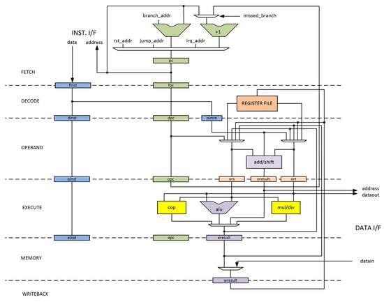 The proposed Variable Delayed Dual-Core Lockstep (VDCLS) technique is implemented using the CCRV32ST processor core [,,] utilizing the RISC-V standard “GC” instruction set. The CCRV32ST integer pipeline is depicted in Figure 2. Its main features are: