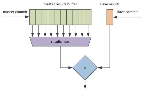 The first step during the VDCLS implementation was to develop the Checker Module (Figure 4). The Checker Module receives the main outputs from the master and slave cores, optionally calculates output signature and buffers the results. The main core outputs consist of the current core program counter, executed instruction, instruction result and stored data. In the classic approach, when the slave core is delayed, e.g., by two clock cycles, the comparison is straightforward as it is made between the master core results and the slave core results delayed by a constant number of clock cycles. In the discussed case, the Checker Module constantly tracks the delay between the two cores and selects the appropriate slave core results for the comparison.