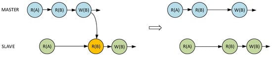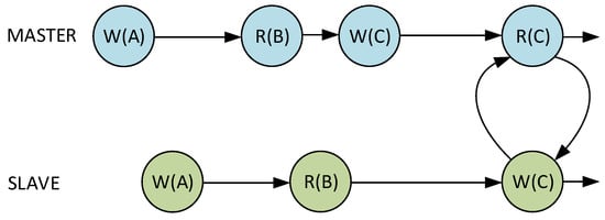 Figure 6 shows the exemplary situation when the master core performed write operation (W(B)) before the slave core could read the older value (R(B)). The system behavior in such a situation depends on whether the read value is in cache or has to be loaded from the main memory. After a cache hit, the slave core will use the value already existing in the cache memory. Otherwise, the bus transaction will occur causing a load of the incorrect value. To prevent such a situation, the master core is forced to wait for the slave core to finish the previous read operation. The importance of the cache transaction monitoring and synchronization mechanisms is shown in the Figure 7. It depicts the hypothetical situation when master and slave cores cause an entire system deadlock. The improperly implemented synchronization between both cores can lead to a situation when master and slave cores will indefinitely wait for each other to complete the operation. The implemented hardware mechanisms were extensively verified through PC simulation to ensure non-deadlock operation and maintain data coherency between master and slave cores. As a result, no external assistance from user software or compiler is needed. The VDCLS processor executes the same binary files as the original CCRV32ST processor core.