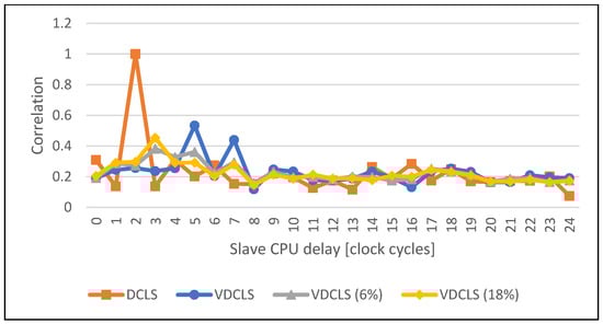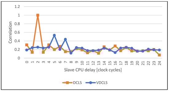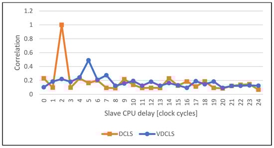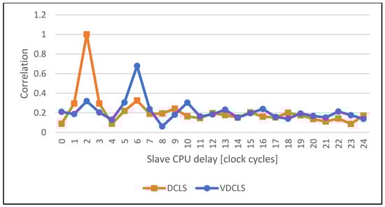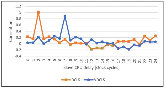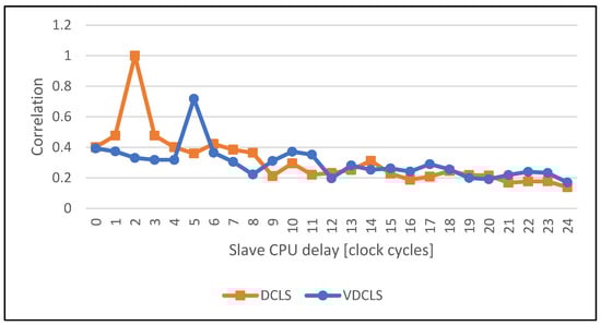 The execution trace presented in Figure 9 shows that, indeed, the slave core delay does not have to be constant and the VDCLS implementation can execute software correctly. On the other hand, the presented figure shows only a very time-limited trace that is hard to analyze. To overcome this problem, we implemented test logic in the processor core that counts DFFs toggles in the execution stage. We choose the execute stage as the most representative one in the processor pipeline. The execute stage is responsible for the calculation of instruction results, address generation, interrupt and exception evaluation. In the real ASIC design, the toggle count will transform into power consumption trace, the tool that is most commonly used for power analysis attacks []. By having toggle count traces, we could use formula (1) to calculate their correlation with different delays. The first and second formula variables are the toggle count traces of the master and slave cores, respectively. The number of samples represents the simulation time in clock cycles. The function argument d is the offset in clock cycles between the master and slave core traces. We can anticipate that in the classic DCLS approach the execution correlation between the two cores will reach the maximum at the value equal to the number of clock cycles of slave core to master core delay.