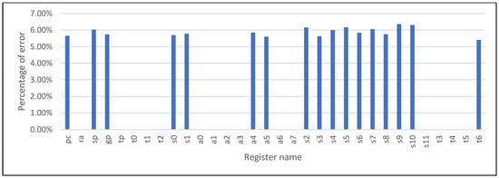 To evaluate and confirm fault coverage of VDCLS, we adopted the fault injection technique used in []. We prepared a matrix multiplication benchmark that uses random generated 16 × 16 matrices of 32-bit integer elements. During PC simulation, after matrices initialization, an error is injected to a random position of randomly selected register file entry or PC register in the master core. We run the processor design under test (DUT) PC simulation in parallel with golden reference model for covering errors undetected by the Checker Module. We injected 14,068 faults resulting in 7233 (51.41%) errors. Figure 20 shows the percentage of errors caused by the particular registers. Some registers never caused error. This is due to the fact that the compiler does not use all registers, and in some cases, registers are overwritten by the software before a fault activates. Table 3 shows that as expected VDCLS achieves 100% fault coverage.