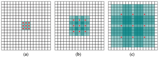 Schematic diagram of receptive field size changes under different expansion parameters. (a) The expansion parameter is 1. (b) The expansion parameter is 2. (c) The expansion parameter is 4.