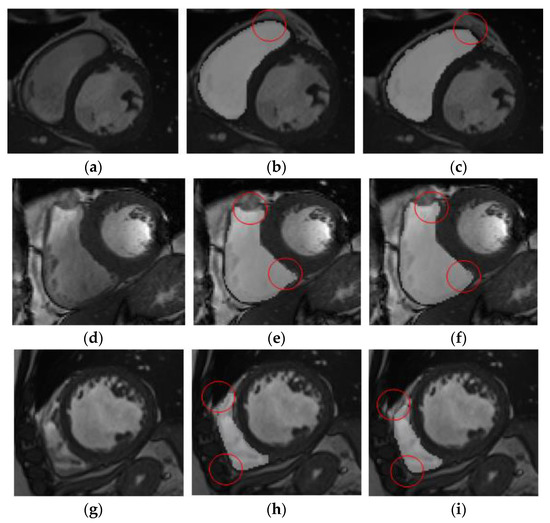It may be observed from Figure 5b,c that the result of network segmentation was consistent with the result image marked by experts. However, it may be observed from Figure 5e,f that the network-segmented and expert-labeled images were under-segmented at the apex of the heart. It may be observed from Figure 5h,i that the network-segmented image and expert-labeled image exhibit the problem of over-segmentation near the ventricular wall. The position shown in the red circle represents the difference between the gold-standard image and the segmentation prediction area. Therefore, although the results of the U-Net network were feasible for segmentation of the right ventricle, there was an error in the segmentation of images with complex ventricular shapes.