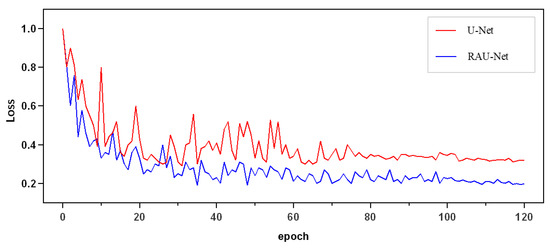 Figure 5 shows the change in the loss values of the two networks in the verification set. The red curve represents the loss value change of U-Net on the training set, and the blue curve represents the loss value change of RAU-Net on the training set. It may be observed that the RAU-Net network exhibited a better convergence speed and convergence effect than the U-Net network on the verification set.