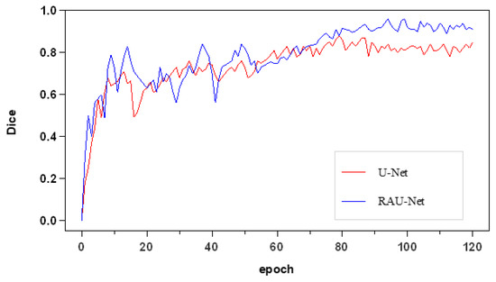 Figure 7 shows the change in the Dice coefficients of the two networks on the verification set. The red curve represents the change in the Dice coefficient of U-Net on the verification set, and the blue curve represents the change in the Dice coefficient of RAU-Net on the verification set. It may be observed that the fitting effect of the RAU-Net network was better than that of the U-Net network, but the Dice coefficient was 0.91 after dividing 120 batches, indicating that the performance of the network still has room for improvement.