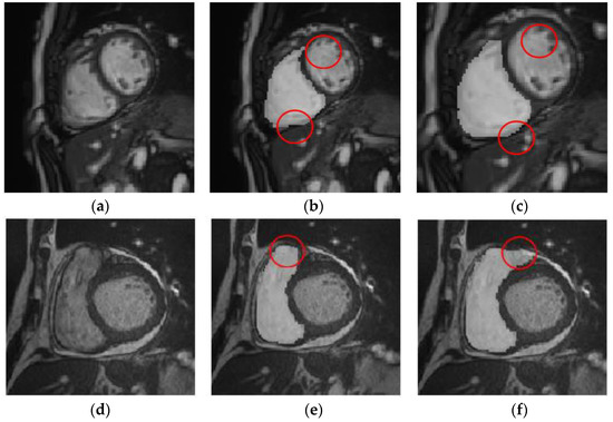 The results of right ventricle segmentation by the RAU-Net network are shown in Figure 8, which shows two groups of images, each of which is divided into three groups. Figure 8a,d are the input feature images, Figure 8b,e are the resulting images of the U-Net network segmentation, and Figure 8c,f are the gold-standard images marked by experts. The position shown in the red circle represents the difference between the gold-standard image and the segmentation prediction area.