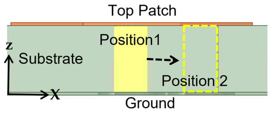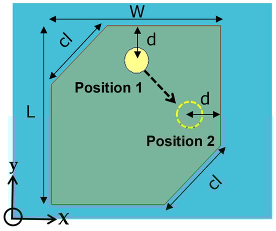 Figure 1 and Figure 2 show the top view and side view of the patch antenna with its different features (, d, L, and W), respectively. The substrate is RT/Duroid 5880 ( = 2.2 and tan = 0.009), with a thickness of 0.79 mm. The antenna shows two possible orthogonal feeds: Position 1 and Position 2. Each position is used to realize either left-hand circular polarization (LHCP) or right-hand circular polarization (RHCP). The antenna is not aimed at serving the purpose of dual polarization (LHCP and RHCP). Hence, LHCP and RHCP will not be obtained simultaneously. The antenna is a square corner-truncated patch. We anticipate that both LHCP and RHCP can be obtained for the same L, W, and cl values by feeding the antenna at a distance ‘d’ away from the edge of the antenna at Position 1 and Position 2 in an alternating manner. Therefore, considering the same value of ‘d,’ we can use ML algorithms to predict the LHCP and RHCP antenna design parameters.