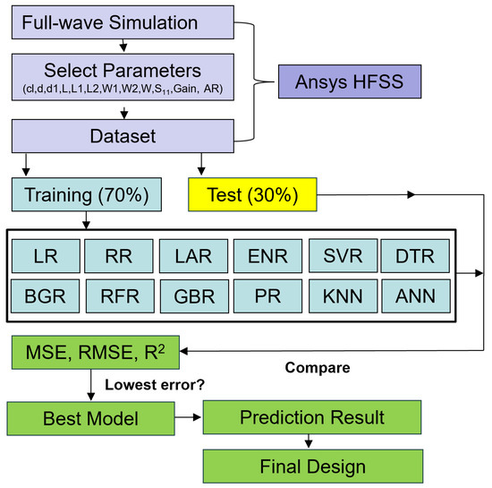 The complete framework to find an effective ML model is shown in Figure 3. The full-wave simulation was used to generate 715 arbitrary datasets of four features (, d, L, and W) and three corresponding targets (, gain, and AR) at 32 GHz. To generate the dataset, we conducted a parametric analysis using the High-Frequency Structure Simulator (HFSS). The initial values of cl, dl, L, and W ranged from 0.1 mm, 0.2 mm, 2 mm, and 2 mm, respectively, with increments of 0.1 mm. The final values reached 1.8 mm, 0.8 mm, 4 mm, and 4 mm, respectively. Since we employed a square-shaped microstrip patch antenna, the values of L and W were kept similar. The data distribution is visually represented in the histogram plot shown in Figure 4. The datasets are then trained using 12 different ML regression models based on linear regression (LR), ridge regression (RR), lasso regression (LAR), elastic net regression (ENR), decision tree regression (DTR), bagging regression (BGR), random forest regression (RFR), gradient boosting regression (GBR), polynomial regression (PR), SVR, KNN, and ANN.