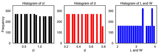 Histograms of the dataset of features (cl, d, L, and W) used for the ML algorithms.
