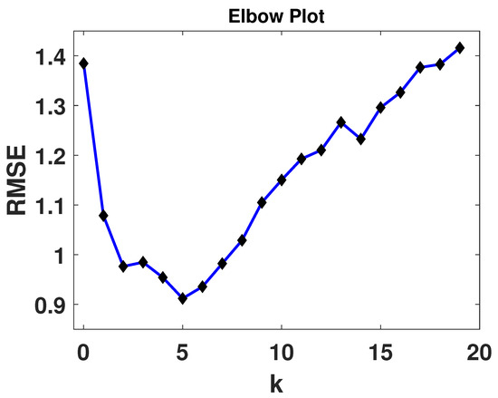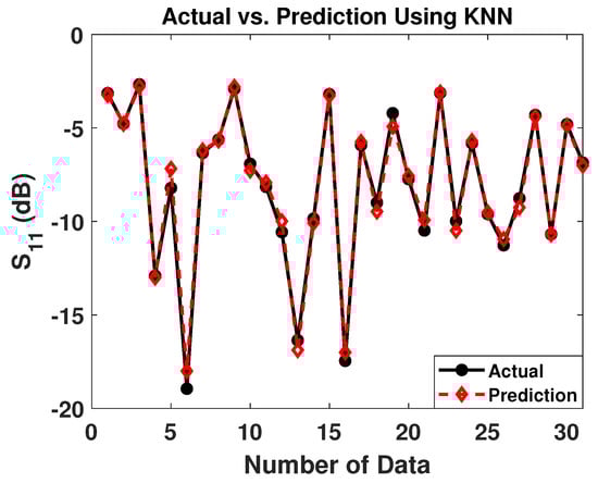 The KNN is a straightforward ML algorithm applied for classification and regression. KNN saves all of the available data, and new input is categorized based on how similar it is to the already recorded data. Typically, a distance metric, such as the Manhattan distance or Euclidean distance, is used to construct the similarity measure. A hyperparameter that needs to be set beforehand is the value of k. A proper way to find the value of k using the elbow method is shown in Figure 5. It is a representation of k vs. error (RMSE). The value of RMSE is lowest for , and that was determined using grid search cross-validation (GridsearchCV). KNN provides the new data point of the antenna during regression, which shows the average value of the k nearest neighbors [13].