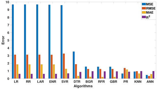 Bar chart showing the error for different ML regression models shown in Table 1.