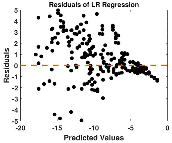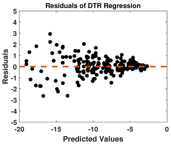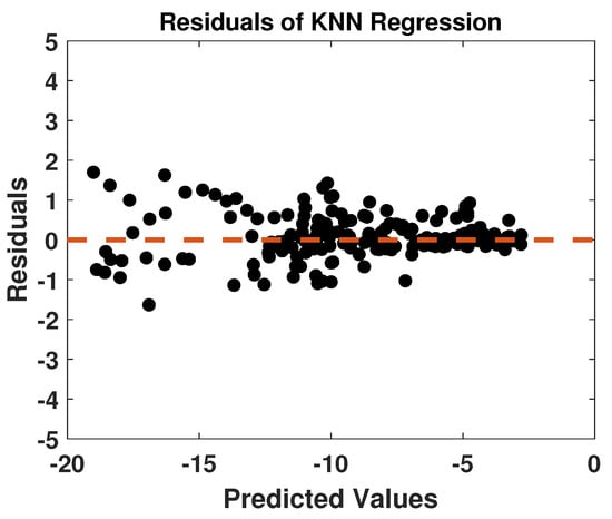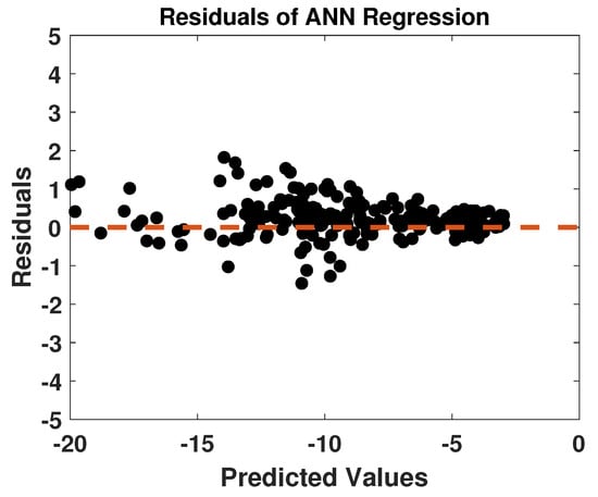The performance of each model is analyzed by computing and comparing the MAE, MSE, RMSE, and R score to find the best model using the Python programming language on Jupyter Notebook. The lowest MAE, MSE, and RMSE and the highest R score are desirable for accurate prediction. Notably, the ANN model exhibits the lowest MAE, MSE, and RMSE and the highest R score. Table 1 shows the error metrics for all regression models. The second model, which shows better results, is KNN. Figure 7 shows the bar chart indicating MAE, MSE, RMSE, and R scores for all regression models used in this paper. Figure 8, Figure 9, Figure 10 and Figure 11 show the residual results for LR, DTR, KNN, and ANN regression, respectively. Figure 12, Figure 13, Figure 14 and Figure 15 show the actual and predicted results for LR, DTR, KNN, and ANN regression, respectively.