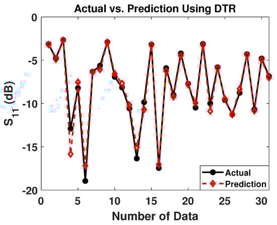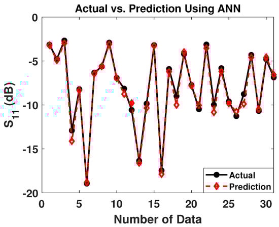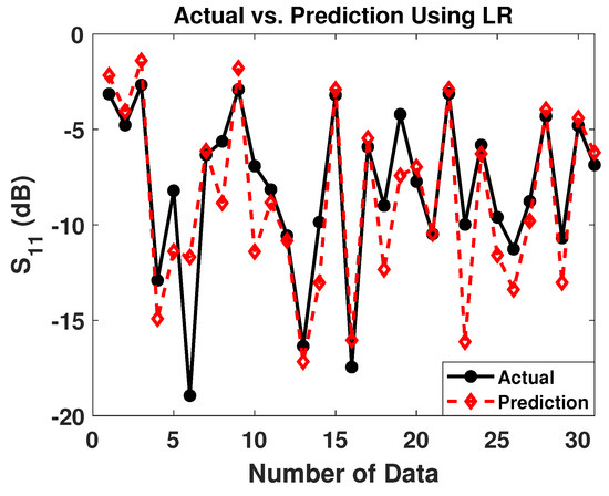 The ANN regression shows a more accurate prediction compared to LR and DTR. For instance, in the LR model, the large number of residuals is responsible for the highest MAE, MSE, and RMSE and the lowest R scores, as shown in Table 1. We note that the KNN can be a secondary option, as it shows results close to ANN. However, PR, BGR, GBR, RFR, and DTR models can also be used as secondary selections with comparatively lower MAE, MSE, and RMSE, among other models (LR, RR, LAR, ENR, and SVR). Table 2 shows the predicted , realized gain, and AR for an arbitrary antenna ( = 0.88 mm, d = 0.58 mm, L, and W = 2.73 mm) at 32 GHz, with values of −13.70 dB, 7.63 dBic, and 0.71 dB, respectively. The features or design variables are chosen arbitrarily, as our model can predict design targets of a circular polarized (CP) antenna for any given dataset.