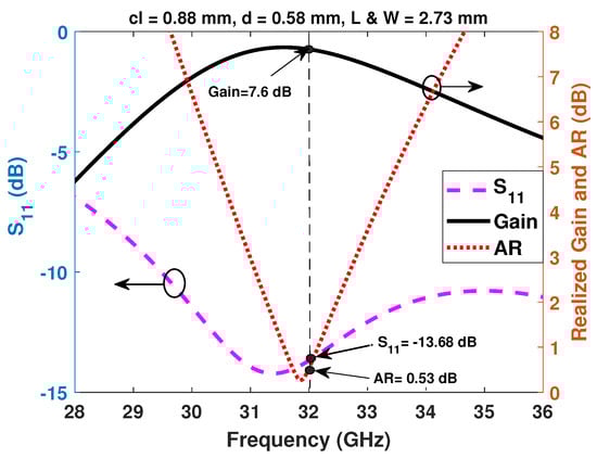 We validated the predicted antenna ( = 0.88 mm, d = 0.58 mm, L, and W = 2.73 mm) using full-wave simulation (High-Frequency Structure Simulator (HFSS)). The target prediction using all ML algorithms and true values (full-wave simulation) is shown in Table 2. As expected, the simulated , realized gain, and AR are almost identical to the ANN prediction at 32 GHz, with values of −13.68 dB, 7.6 dBic, and 0.53 dB, respectively, as shown in Figure 16. Our objectives are to obtain a gain of >5 dBic across a 10% bandwidth, an axial ratio (AR) of <3 dB, and a return loss of <−10 dB. Meanwhile, we obtained a gain of >6.4 dBic across a 14% bandwidth (29.5 GHz–34 GHz) and an axial ratio (AR) of <3 dB (31 GHz–33 GHz).