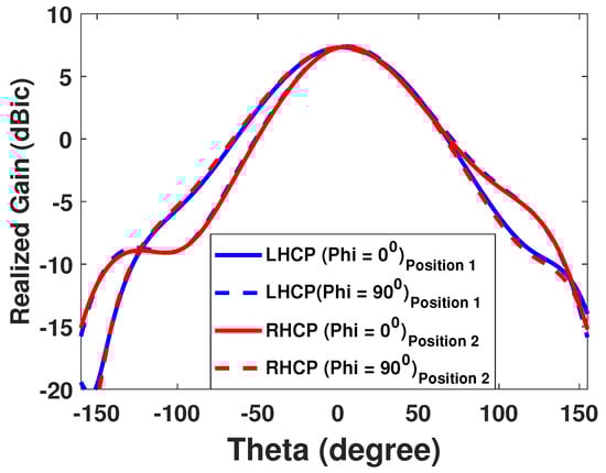 We validated the LHCP and RHCP using the same antenna parameters by switching the orthogonal feeding position from Position 1 to Position 2, as illustrated in Figure 1. Our presented antenna is a square patch with corner perturbation, providing LHCP and RHCP alternatively using two orthogonal feedings. Our ML model accurately predicts the design of both individual LHCP and RHCP antennas. Figure 17 shows the realized gain and AR at 32 GHz for both LHCP and RHCP when the feeding position is in Position 1 and Position 2, respectively. The broadside realized gain is 7.6 dBic at 32 GHz in the elevation plane for both polarizations. Additionally, the simulated AR at the broadside is 0.53 dB. As such, the simulated result greatly agrees with the prediction result. This verification demonstrates that the ANN model outperforms all other ML regression models in terms of prediction.