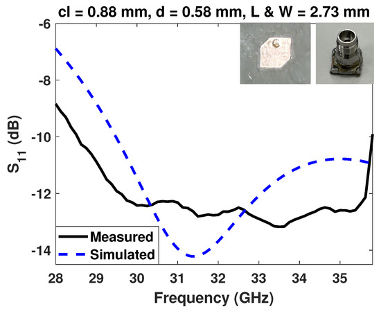 Simulated and measured for the predicted antenna. Inset shows the fabricated antenna top (left) and bottom view with a 2.4 mm connector (right).