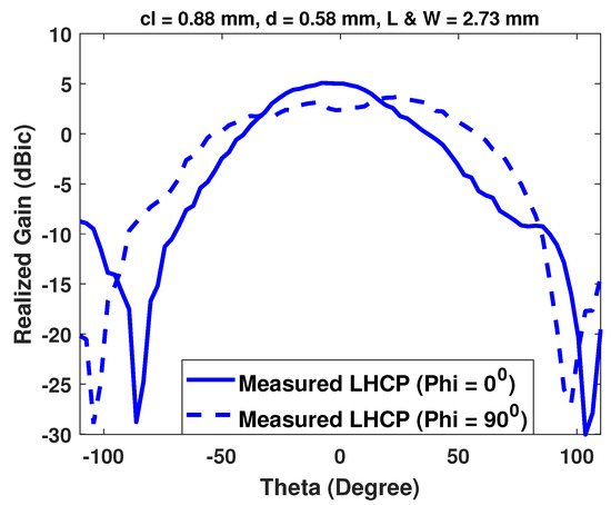 We fabricated a prototype for the LHCP to validate the concept. A standard milling machine was used for the fabrication. A 2.4 mm connector was used to feed the antenna for measurement. Figure 19 shows the simulated and measured of the LHCP antenna. The predicted is −13.7 dB, the simulated is −13.68 dB, and the measured is −12.75 dB at 32 GHz. Therefore, the measured data agree well with the simulated and predicted values. Figure 20 shows the pattern measurement setup at the Ka-band (26.5 GHz–40 GHz). Figure 21 shows the measured realized gain of the LHCP antenna for both the E plane and the H plane at 32 GHz. The maximum gain at 32 GHz is 5.01 dBic, and the 3 dB beam width is , whereas the simulated beam width is . Figure 22 shows the simulated and measured realized gain and AR of the LHCP antenna. The predicted, simulated, and measured realized gains are 7.63 dBic, 7.6 dBic, and 5.01 dBic, respectively, at 32 GHz. The predicted, simulated, and measured AR are 0.71 dB, 0.53 dB, and 2.3 dB at 32 GHz. The slight discrepancy between the simulation and fabrication outcomes is due to fabrication inaccuracy and soldering of the connector. During the soldering process, we encountered a challenge where the antenna’s ground plane did not securely attach to the connector base. To address this issue within the constraints of our fabrication process, we applied additional soldering resin to establish a connection. We believe this irregularity in the ground plane’s current distribution contributed to discrepancies between the simulated and measured data. Under ideal conditions, we would expect these discrepancies to be significantly reduced. However, the result is acceptable for validating the proof of concept. The properties of the different ML algorithms for designing the antenna are summarized in Table 4. Our study introduces an approach that considers multiple objectives, including , AR, and gain, as well as antenna polarization. This contrasts with most other research efforts, where the primary focus is estimating .