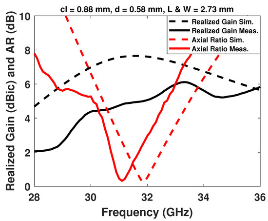 Full-wave simulation showing , realized gain, and AR of predicted antenna.