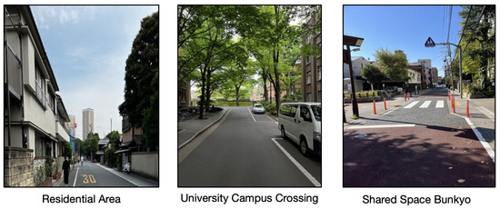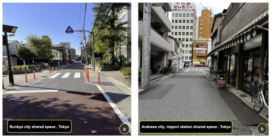 In Tokyo, there are many common shared spaces. In several spots we have visited in Tokyo, as depicted in Figure 9, we can imagine the interactions between automobiles, bicycles, and pedestrians without the usual traffic signs or signals. We captured this occurrence in Bunkyo (a) and Arakawa (b), Tokyo, Japan, where traffic passes, particularly during rush hours. Looking into the future, with the introduction of AVs, it becomes crucial to consider putting in place an efficient eHMI system in these shared places to emphasize pedestrian safety. We may provide an organized and secure environment to guarantee the security and effectiveness of these interactions by using aspects of eHMI technology. As AVs become prevalent in urban planning, new social challenges arise. They must navigate through crowds and handle interactions formerly managed by human drivers. In response, scientists and engineers are diligently creating algorithms for AVs to navigate public spaces while adhering to social norms regarding proximity and motion [80]. The absence of human drivers prompts questions about AVs’ ability to navigate diverse environments and select appropriate interaction methods. Despite ongoing AV technology improvements, shared spaces need more insights into real pedestrian–vehicle interactions. Additionally, robust data are essential to support relevant external interaction design [83].