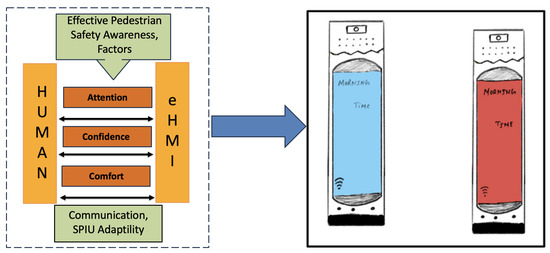 The external human–machine interface, often known as eHMI, is a crucial idea that has evolved to address this problem. eHMI focuses on developing strategies that aid dialogue and comprehension between autonomous cars and bicycles or pedestrians. It seeks to offer a smooth and effective contact environment that promotes confidence and trust [25,26].
