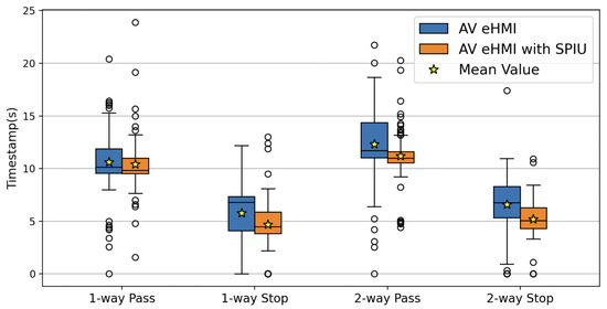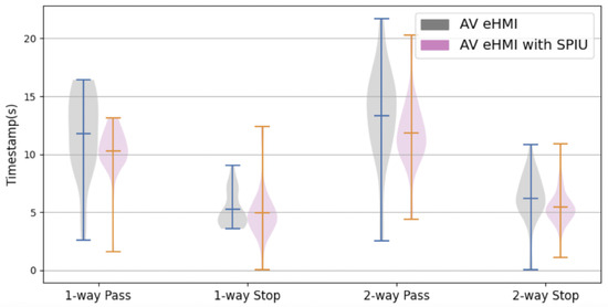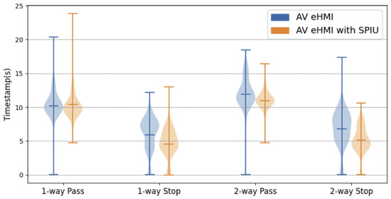 We invited 16 participants to take part in this study; the task of the participants involved making decisions about crossing the road with and without the SPIU under two different conditions: (1) with the AV eHMI coming from one direction only (one-way scenarios) and (2) with the AV eHMI approaching from two different directions (two-way scenarios). The figure is depicted in Section 3.3.1 and Section 3.3.2, respectively. Participants used the VR trigger button to measure their time level and intention to indicate their decision-making time. The users’ study participants were instructed not to press the trigger button if they did not decide. The meanings of the different colors on the eHMI were not disclosed to the participants. By wearing the VR headset and using the trigger button, the participants actively engaged with the virtual environment and provided valuable feedback based on their understanding in multiple trials. The VR scenarios accurately represented approaching AVs and allowed us to interpret the conveyed intentions using the eHMI. Stadler et al., in their findings, show considerable differences in decision times throughout their trials between the control group and several HMI (human–machine interface) approaches. Specifically, the HMI concepts showed average reaction speeds between 2.0 and 3.0 s, whereas the control group’s average reaction time was 4.8 s. They go into great detail in their study on these results [86]. Furthermore, virtual reality (VR) technology was used to explore pedestrian safety in a separate study by Deb and associates [87] in 2017, providing a safe option for test subjects. We also utilize VR technology in our research and intend to broaden our experiments in follow-up studies, building on their knowledge. Our study includes methods addressing real-life challenges, including vehicles coming from opposite directions. The participants considered information from the SPIU and the eHMI displayed on the AV to make precise decisions.