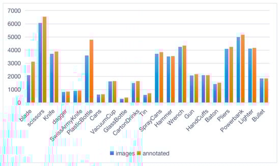 LSIray, an X-ray image dataset for prohibited item detection, consists of 37,106 images with 21 categories of prohibited items, and is the largest and most comprehensive dataset of its kind to date. The categories include Blade, Scissor, Knife, Dagger, SwissArmyKnife, PlasticBottle, Cans, VacuumCup, GlassBottle, CartonDrinks, Tin, SprayCans, Hammer, Wrench, Gun, HandCuffs, Baton, Pliers, Powerbank, Lighter and Bullet. These items are frequently forbidden or restricted in public areas, such as subway stations and airports. Each category contains at least 200 images distributed across training, validation and test sets in a ratio of 8:1:1 (29,686 images for the training set and 3710 images for the validation and test sets each). Detailed annotation information is provided for each image, including the item’s category, location, size, orientation, material and occlusion level. Figure 1 shows the image and annotation quantities for each category. The dataset is characterized by high quality, quantity, difficulty and challenge due to the complex interactions and occlusion relationships among the items as well as the large variations in shape, size and material of the items.