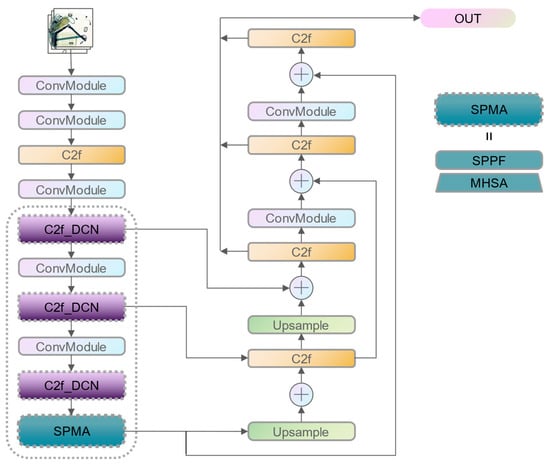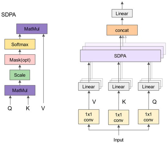 A novel module, named Spatial Pyramid Multi-Head Attention (SPMA), is proposed, which aims to enhance the diversity and complexity of features in the backbone network of YOLOv8 and to adapt to the targets of different shapes and angles in X-ray images. The SPMA module combines the Multi-Head Self-Attention (MHSA) mechanism, which can capture the long-range dependencies and relationships between pixels, and the Spatial Pyramid Pooling with Fusion (SPPF) module, which has the ability to extract multi-scale features from different levels of the feature pyramid. The SPMA module consists of two sub-modules: the SPPF sub-module and MHSA sub-module, as shown in Figure 2. The SPPF sub-module applies spatial pyramid pooling to different scales of the feature maps and fuses them together to obtain a more rich and diverse feature representation. The MHSA sub-module applies the multi-head self-attention mechanism on the concatenated feature map, thus utilizing feature information from different levels and aspects and increasing the diversity and complexity of target detection. First, four scales are divided from the input feature map, and max pooling is performed on each scale. Next, concatenation along the channel dimension is performed after upsampling the pooled feature maps to match the size of the input feature map. The concatenated feature map is next subjected to a 1 × 1 convolution layer in order to minimize the channel count and fuse features from various scales. The MHSA sub-module is illustrated in Figure 5, where three separate 1 × 1 convolution layers are used on an input feature map to generate query (Q), key (K) and value (V) matrices. These matrices are then divided into N heads for applying the scaled dot-product self-attention (SDPA) mechanism individually within each head. Finally, these N heads are re-concatenated, followed by a 1 × 1 convolution layer, which results in obtaining the final output feature map.