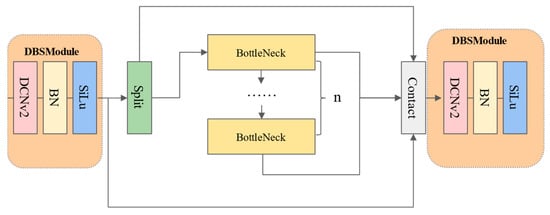The structure of the C2f_DCN module, which consists of four sub-modules: DBSModule, Split, DarknetBottleneck and Contact.