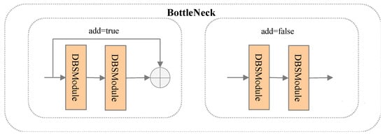 The CSPnet Deformable Convolution Network (C2F_DCN) module is proposed, which is a novel feature fusion module that can adapt to the shape and pose changes in the objects in security checks. As shown in Figure 3, the C2F_DCN module consists of four sub-modules: the Deformable Bottleneck with SiLu (DBSModule), the Split, the DarknetBottleneck and the Concat. The C2F_DCN module splits the input feature map into two parts along the channel dimension. One part goes through the DBSModule, which applies a deformable convolution, a batch normalization and a SiLu activation function to extract low-level features. The other part goes through the DarknetBottleneck, which contains several deformable bottleneck blocks to extract high-level features. The final output feature map is generated by concatenating the DBSModule and DarknetBottleneck outputs along the channel dimension. DarknetBottleneck has two kinds of structures, as shown in Figure 4. In DarknetBottleneck, deformable convolution also replaces standard convolution. However, not all standard convolutions are replaced, and deformable convolutions are used only when the size of the convolution kernel is 3 × 3. If the size of the convolution kernel is 1 × 1 or another value, standard convolution is still used. The reasons are due to: (a) A 3 × 3 convolution kernel is one of the more common and effective sizes that improve a network’s depth and expressiveness while keeping its receptive field and number of parameters unchanged. Deformable convolution can further enhance the flexibility and adaptability of the 3 × 3 convolution kernel, allowing it to capture more detailed information about the objects. (b) If the size of the convolution kernel is too small or too large, using deformable convolution may have negative effects. A 1 × 1 convolution kernel can only operate on a single pixel and has no room for spatial variation; thus, using deformable convolution is pointless. If the size of the convolution kernel is 5 × 5 or larger, using deformable convolution may increase the network’s complexity and computational cost and may cause overfitting or gradient vanishing problems. In summary, using deformable convolution only when the convolution kernel is 3 × 3 is a more appropriate choice as it balances the network’s complexity, stability, flexibility and robustness.