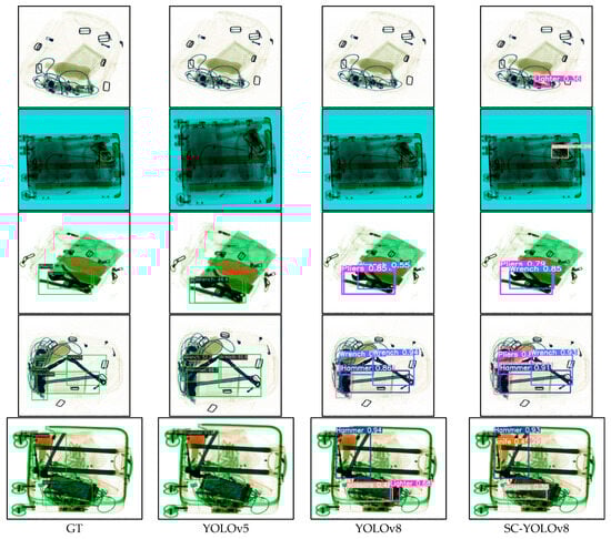 To demonstrate the visual results of SC-YOLOv8, several pictures from the test results that contain different types and quantities of prohibited items were randomly selected. The detection results of YOLOv5, the original YOLOv8 algorithm and the improved YOLOv8 algorithm in different scenes are shown in Figure 6. The first column in the figure is the Ground Truth image, the second column is the YOLOv5 detection result, the third column is the original YOLOv8 detection result and the fourth column is the improved YOLOv8 detection result in this paper.