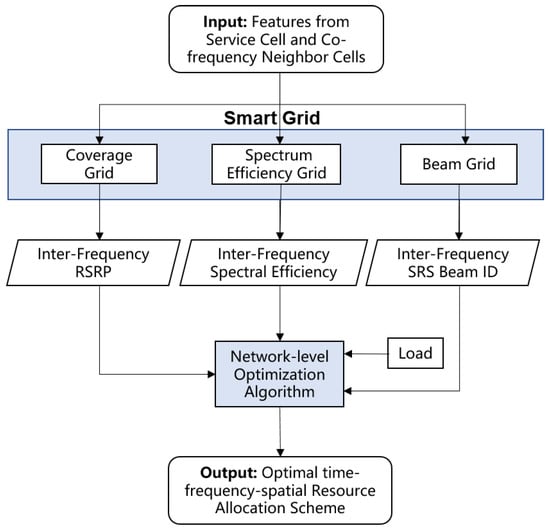 The framework of the time-frequency-space resource allocation method is shown in Figure 7. The input information of the framework uses features from service cells and co-frequency neighbor cells. The output information is the optimal resource allocation scheme. By combining network-level optimization algorithm modules with smart grid technology modules, this framework aims to maximize the network-level user experience in a multi-user, multi-carrier, and multi-beam context. Specifically, we set up an optimization model aiming at the optimal network-level user experience. To determine the time, frequency, and spatial parameters that maximize network performance, we introduce an air interface information prediction method based on smart grid technology, which constructs fingerprint maps using intelligent techniques with features from service cells and co-frequency neighbor cells as training data. The smart grid comprises coverage grids, spectrum efficiency grids, and beam grids. The coverage grids yield information about the inter-frequency RSRP, the spectrum efficiency grids offer insights into inter-frequency spectral efficiency, and the beam grids provide information about inter-frequency SRS beam ID. These grids collectively provide input data for the network-level optimization algorithm. Additionally, cell load information from neighboring cells operating at different frequencies is taken into account to achieve optimal results in resource allocation. By solving the optimization algorithm, an optimal time-frequency-space resource allocation scheme is obtained. This scheme facilitates adjustments to the distribution of users and services at the beam level, ultimately enhancing the downlink experience for users across the entire sharing network. The details of the method will be given in Section 4.2 and Section 4.3.