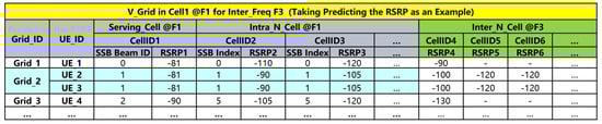To achieve optimal network-level performance for time-frequency-space resource allocation, the optimization formula mentioned above needs to be solved, yielding the optimal parameter combinations. For each user’s utilization of air interface resources on each frequency band , we propose an RSRP prediction method based on smart coverage grids. When the predicted RSRP corresponding to UE in beam n on carrier i at time t falls below a predefined minimum threshold, is set to 0; otherwise, it is set to 1. Note that RSRP, as defined in the 3rd Generation Partnership Project (3GPP) protocol, generally refers to Synchronization Signaling Block (SSB) RSRP or Channel State Information Reference Signal (CSI-RS) RSRP. Here, we refer to SSB RSRP. The frequency domain position of the SSB is independent of the specific allocation of frequency resources b; hence the predicted value of can be obtained from , which, in turn, can be predicted using coverage grids. Moreover, we introduce a prediction method for spectrum efficiency based on smart spectrum efficiency grids, as well as a prediction method for based on smart beam grids. By intelligently predicting the beam ID information of each user, users with the same beam ID are collectively considered, and the total resources are divided by the number of users. We can achieve frequency resource allocation at the granularity of RBGs. As depicted in Figure 8, we achieve predictions for RSRP, spectrum efficiency, and beam ID across different frequency bands by constructing high-resolution smart grids. These predictions provide essential inputs for solving the network-level optimization algorithm.