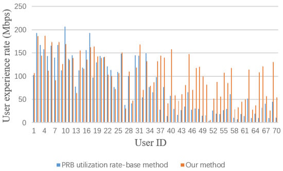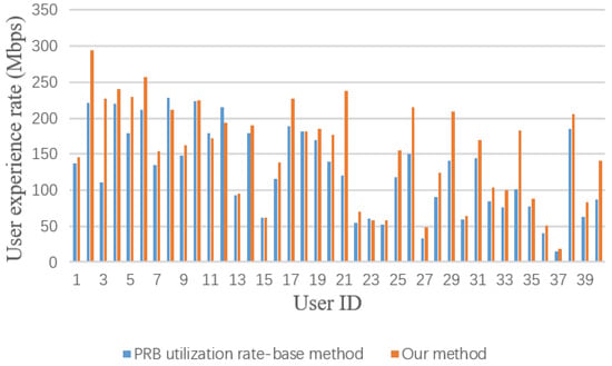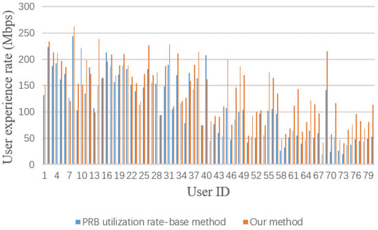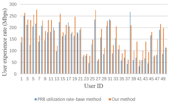 In Figure 11, Figure 12, Figure 13 and Figure 14, we demonstrate the user experience rate of each user. Blue indicates the method based on the PRB utilization rate, and orange represents our proposed method based on time-frequency-space optimal resource allocation. As we can see, almost all of the users show a higher user experience rate than the traditional method. Although the performance of a small number of users is degraded, the overall user experience of the entire network has greatly improved. As shown in Figure 15, it is the average experience rate of the overall users. We can see the performance improvement for all the four experience scenes.