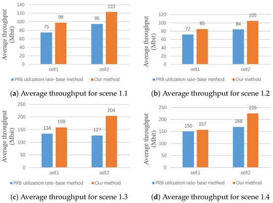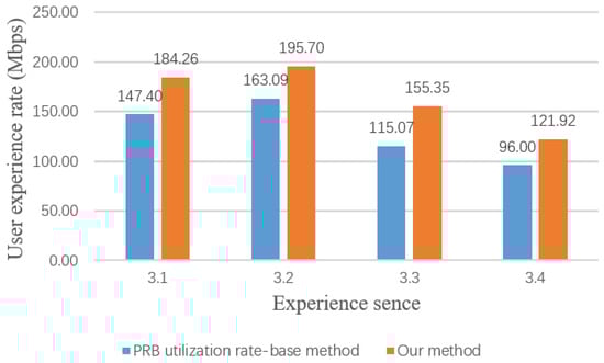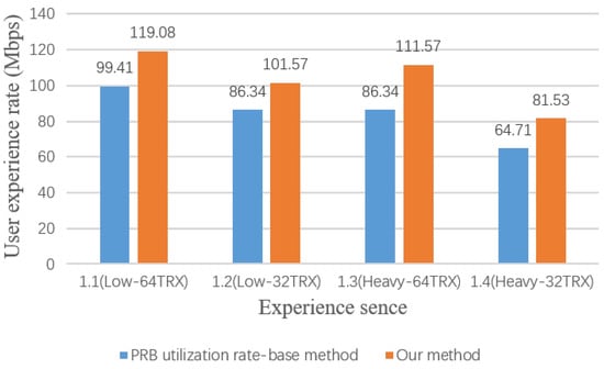Compared with Table 7, we can find that under the same load and user distribution, the network-level user experience improves with the increase in bandwidth, and in the case of large bandwidths, the advantages of our approach are further amplified. Because more frequency-domain RB can be used in this situation, more RB combinations can be selected by different users under multi-user arrangement, which is equivalent to an increase in freedom in resource allocation. Figure 17 shows the average experience rate for different methods and scenes. Although the available RB of PRB utilization-based methods also increases, our method can better coordinate time-frequency-space three-dimensional resources, leading to higher gain. Additionally, the average experience rates for different methods and scenes are shown in Figure 17.