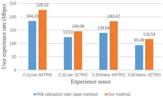 The aforementioned evaluation focuses on the networking modes involving two inter-frequency carriers. In this part, we verify the performance of the proposed method with three inter-frequency carriers, including TDD 3.5 G, TDD 3.5 G, and FDD 2.1 G. The performance gains involving different loads and different numbers of antennae are demonstrated in Table 9. Our method owns 20–35% gain compared with the traditional method. Additionally, the average experience rates for different methods and scenes are shown in Figure 18. Our approach has obvious advantages.