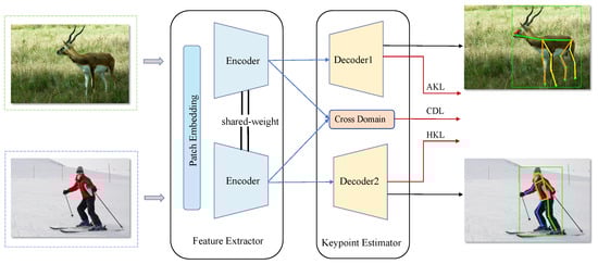 The existing works of vision-based APE are classified into two main categories. The first focuses on directly transferring the exiting human pose estimation (HPE) methods to animals [3]. The performance of this kind of APE method is constrained by the difference in skeletal structure between humans and animals, so the results of APE are hardly comparable to the accuracy achieved by HPE. The second group of methods uses human data or synthetic animal data to learn the APE models [4,5,6]. In these methods, initial and weak models are built to generate the pseudo-labels for unlabeled images. Then, the synthetic animal data and the real animal images are incorporated into the training stage to learn the APE model. This kind of method is also called cross-domain APE.