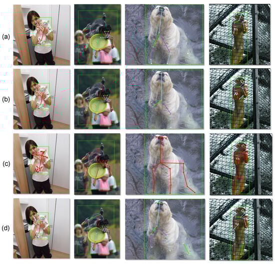 Visual comparison between different methods on the AP-10K. (a) SB-resnet50, (b) HRNet-width32, (c) THANet, (d) ground-truth. We highlight the pose predicted by THANet with red lines.