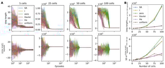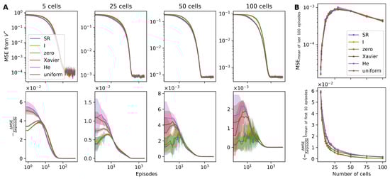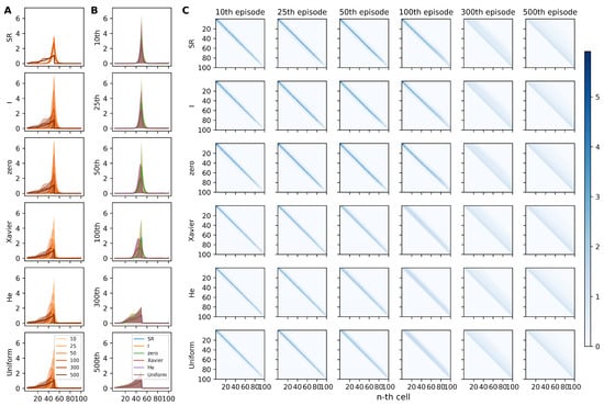 We examined the rate of MSE decrement, represented as (the lower panel of Figure 5A). Early episodes, up to the 10th, illustrated a higher decrement rate in the randomized agents, indicating a more rapid reduction in the MSE value. It is noteworthy that among the random agents, those initialized utilizing the He and Xavier methods depicted a steeper reduction relative to those initialized uniformly (the lower panel of Figure 5A,B).
