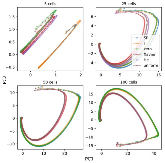 Principal component analysis (PCA) of the SR place field matrix learning history shows that SF agents with random weights take shorter routes to converging optima. The simulated results from four different sizes of grid worlds () are shown. Each dot shows the PCA results of SR place fields after each episode (*, first episode). Each line shows the historical route of the SR place field learning from SR or SF agents (SR, blue; SF weight initialization with identity matrix, orange; zero matrix, green; the Xavier method, red; the He method, purple; the uniform distribution, brown). The average of the SR place field matrices from 10 simulations was used for PCA. The distinct trend in the fourth image arises from a PCA of a large weight matrix. Its unique pattern, differing from the other images, may reflect specific variances or features within the matrix. The exact cause remains an area for further exploration.