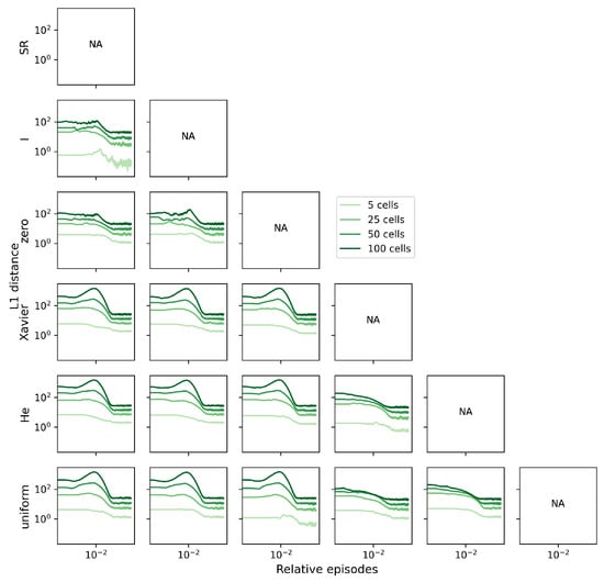 To mitigate the influence of the SR matrix’s size on the L1 distance, we can divide the L1 distance by the total number of elements in the matrix (). This normalization procedure brings the metric down to the level of a single SR matrix element and further emphasizes that the distance between the randomly initialized agents and the non-random ones tends to increase (Figure A2).