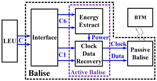 As shown in Figure 2, the balise mainly consists of an interface circuit, an active balise, including an energy extraction circuit and a clock data recovery circuit, and a passive balise. The interface circuit separates the C signal sent by the LEU into C6 and C1 signals, and then the energy extraction circuit converts the C6 signal into a stable power supply, to power the clock data recovery circuit, which extracts the clock and the data signal in the C1 signal and gives it to the passive balise. When a train passes by, the BTM releases a signal through an antenna, to activate the passive balise and exchange information.